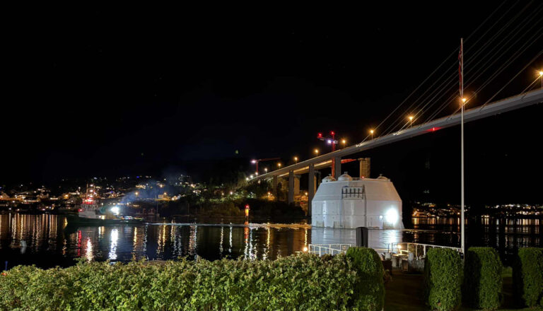 3,5K og 10K er sjøsatt og setter kursen mot Eydehavn. Globene ble flyttet via små hydrauliske vognsystemer ut til kaien hvor kranen Uglen, med løftekapasitet på 800 tonn, sto klar. Globene ble sjøsatt og slept videre til Eydehavn, hvor de…